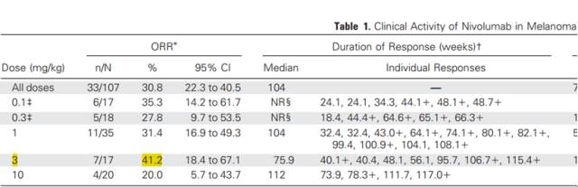 2014年的JCO更新了纳武单抗针对恶黑的多剂量临床数据,较终确认:3mg/kg的剂量可靠数据较高,达到了41.2%;而10mg的这一组可靠数据只有20%。具体如下图:
