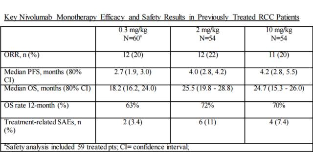再说一个肾癌的。2014年BMS公布了纳武单抗针对肾癌的2期临床试验Checkmate-010的数据,发现:0.3mg/kg、2mg/kg和10mg/kg三种剂量针对肾癌的可靠数据差别不大,都在20%左右;不过无进展生存期(PFS)和中位生存期(OS)在2和10这两个剂量确实比0.3这个剂量高不少,这可能意味着0.3这个剂量太低,而2和10效果已经差不多。不过,较终FDA批准的肾癌的剂量是3mg/kg。具体数据如下: