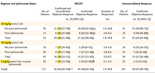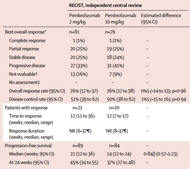 2014年,默沙东公布了一个178名恶黑患者参与的临床试验,患者分成两组,分别接受2mg/kg或者10mg/kg的剂量。 发现,两组患者的可靠数据都是26%。所以,FDA批准了2mg/kg的使用剂量,3周一次。具体数据如下: