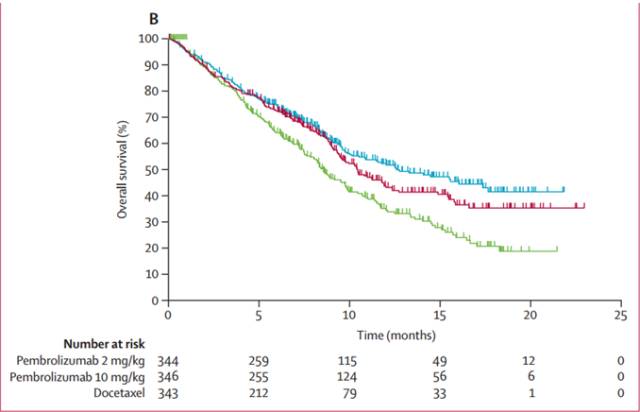 在Keytruda针对PD-L1阳性的非小细胞肺癌的大型三期临床试验Keynote-010中,345名患者接受2mg/kg的剂量,346名患者接受10mg/kg的剂量。结果发现:2mg这一组的中位生存期是10.4个月,10mg这一组是12.7个月;无进展生存期没有差别,分别是3.9和4个月;针对PD-L1高表达(大于50%)的患者,中位生存期分别是14.9个月和17.3个月。中位生存期数据如下: