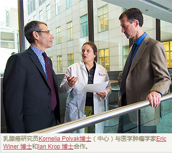 乳腺癌研究员Kornelia Polyak博士(中心)与医学肿瘤学家Eric Winer 博士和Ian Krop 博士合作。