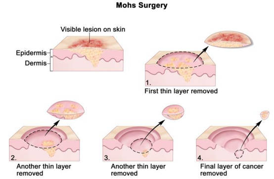 莫氏手术。一种外科手术,以几个步骤去除皮肤上的可见损伤。首先,去除一层薄薄的癌组织。然后,在显微镜下移除第二薄层组织并观察以检查癌细胞。一次去除多个层,直到在显微镜下观察到的组织显示没有剩余的癌症。这种类型的手术是用来尽可能少的正常组织去除。